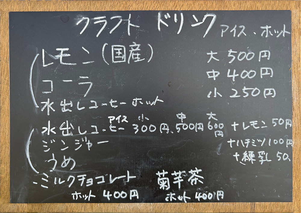 コーラ・水出し珈琲・ジンジャージュース・ラムネ・ミルクチョコレート・菊芋茶